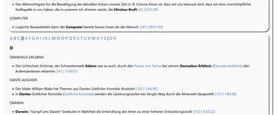 Wie man sieht, ist der Begriff in großen Lettern geschrieben, und im Erklärtext darunter in fett. Ferner gibt es einen Link [151 | 1:01:50], der Link bedeutet, dass es sich um die Textstelle 1 Stunde, 1 Minute und 50 Sekunden handelt. Und dass es um den 151. Vortrag von Wolfgang geht. | |||